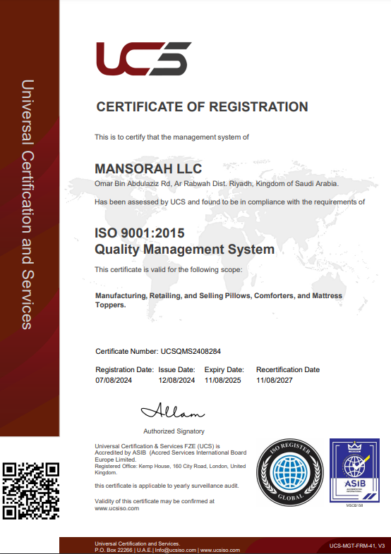 نفخر في مفارش منصورة بحصولنا على شهادة الـ ISO 9001 للجودة والإدارة